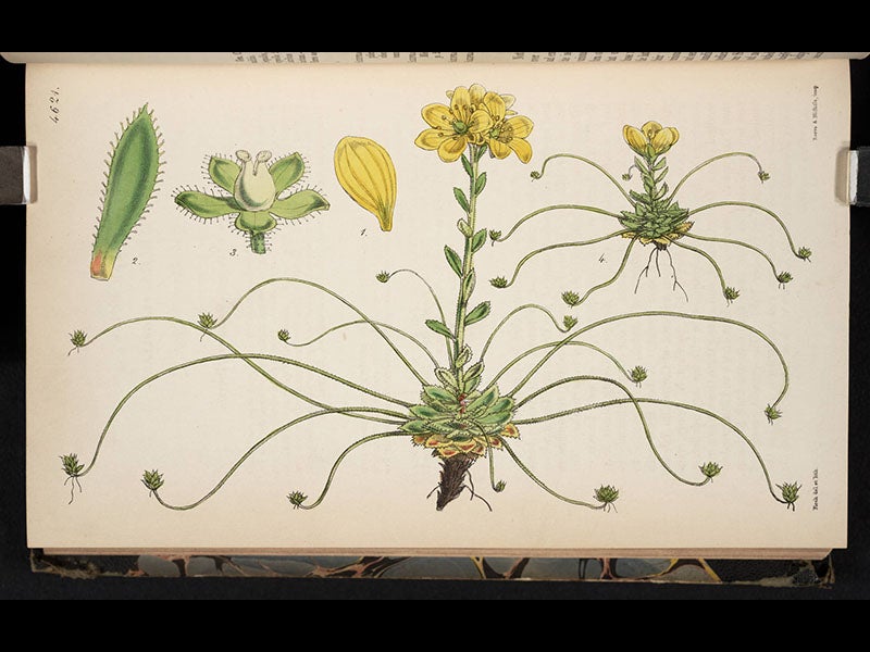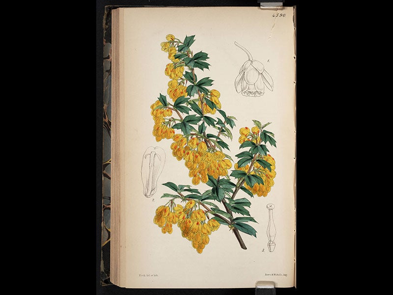 Walter Hood Fitch, a Scottish botanical artist and illustrator, was born Feb. 28, 1817. While still quite young, Fitch came to the attention of William J. Hooker, who was professor of botany in Glasgow and had inherited the editorship of Curtis' Botanical Magazine (CBM). Hooker invited Fitch to contribute some illustrations for the magazine and Fitch did so; his first watercolors, converted to lithographs, were published in 1834, when he was just 17 years old. Fitch continued to collaborate with Hooker for the next forty years. When Hooker was appointed Director of Kew Gardens in 1841 and moved to London, Fitch went with him. Several of Fitch's illustrations for CBM are shown above: a Nepalese poppy (first image), a gentian (second image), a saxifrage (third image), and a barbery from Chile (fourth image). The last is of interest because it was introduced to Kew Gardens by Charles Darwin, who brought back specimens from South America. Two more of Fitch’s illustrations for Curtis’ Botanical Magazine were displayed in our 2009 exhibition, The Grandeur of Life.