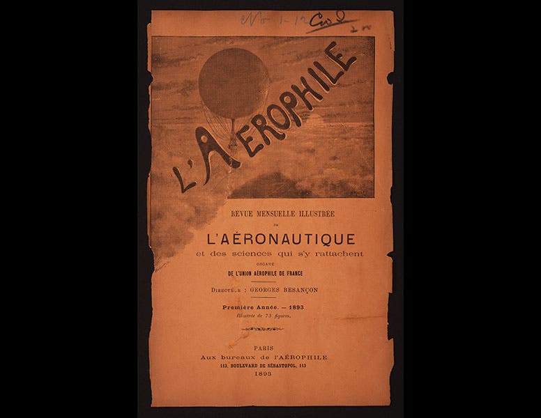 Fonvielle became an advocate for aeronautics in his later life and helped organize the Union Aèrophile de France, over which he presided for some years. The Union in turn founded a magazine, L'Aerophile, in 1893, to which Fonvielle contributed many articles over the next decade (first image). One of the early issues has a profile of Flammarion (sixth image), who was a dedicated balloonist, although he is now more famous as a popular scientific writer. Flammarion amassed an impressive library of books on aeronautics; in 2013, we acquired 27 books from the Flammarion Collection. One of those was a volume by Fonvielle, Les Balloons-sondes (1898). As one can see (seventh image), it is in pristine condition, its original paper covers unsullied, as were most of the books from Flammarion's library.