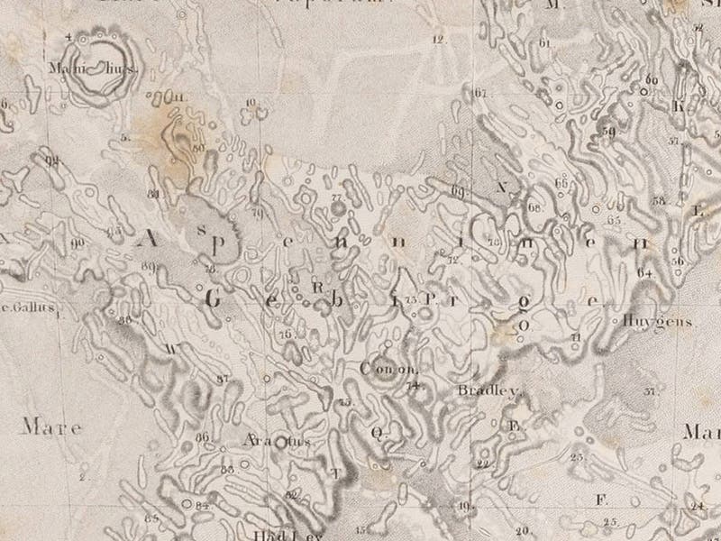 Wilhelm Lohrmann, a German cartographer, died Feb. 20, 1840, at age 44. In 1824, Lohrmann published his Topographie der sichtbaren Mondoberflaeche (Topography of the Visible Lunar Surface) in which he described his technique of using a micrometer to determine the exact position of certain fixed points on the surface of the moon, which he used as reference points to determine the precise positions of all the craters, rilles, and seas. He contemplated an entire lunar map based on his observations, but in 1824, he had completed only four of a projected 25 sections, so that is all he published. You can see all four above; in the order he included them. They show: an area in the lunar highlands that includes the craters Ptolemy and Hipparchus; the Sea of Tranquility, where Apollo 11 would later land; the Sea of Serenity, just below the Sea of Tranquility, and the Lunar Apennines, including the crater Archimedes, where Apollo 15 would land in 1971. The last image is a detail of the fourth plate, allowing us to appreciate the detailed precision that went into drawing and engraving each section.