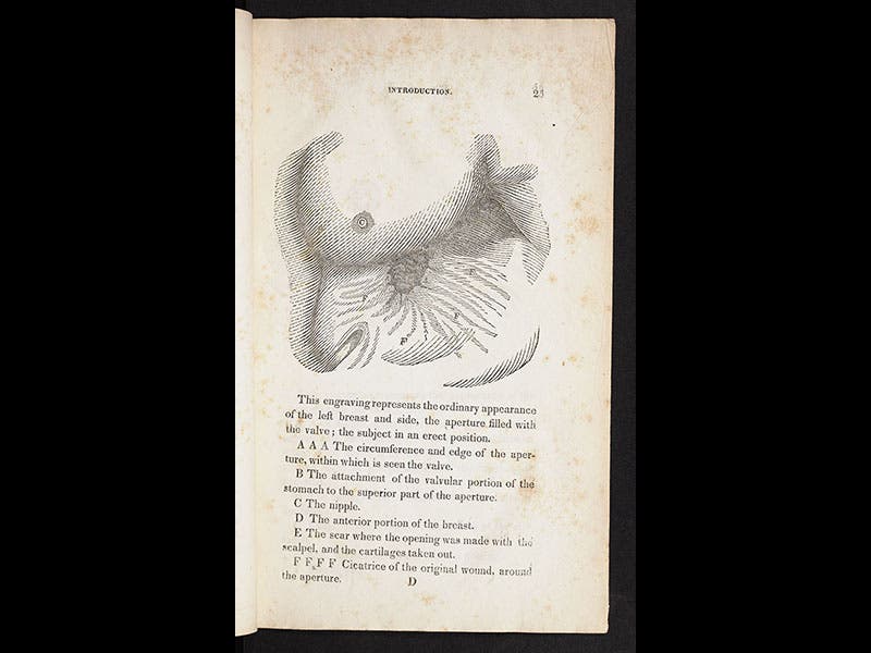 We have a copy of Beaumont's Experiments and Observations in our History of Science Collection (second image); for a long time, it was the only book in the Library printed in Plattsburgh, New York, but then an Air Force document and a recent book on penguins spoiled that singularity. There are three illustrations in Beaumont’s book, woodcuts that show different views of St. Martin’s fistula; it is probably the most reproduced fistula in the history of medicine. We see two of the woodcuts above (first and third images).
