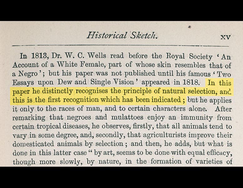 We have Wells’ Two Essays, with its important appendix, in the History of Science Collection; we show the title page above. We also have the fifth edition of the Origin, but in that printing, the paragraph on Wells is split over two pages, so we show above the relevant page from a slightly later edition (1873; fourth image), in which Wells has the top of the page all to himself; in a detail (first image), we have highlighted Darwin’s sentence of praise.