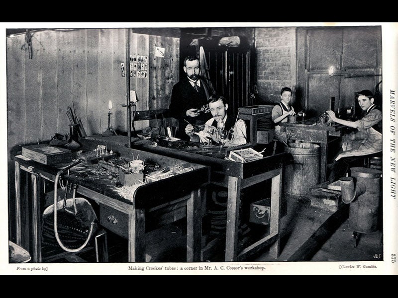 In 1903, Vanity Fair published a colorful caricature of Crookes, which shows both his splendid beard and mustache, and his tube (second image). The first image shows a display of original Crookes tubes at the MUMOK, the Museum of Modern Art, in Vienna. We also see two other tubes with Maltese-cross cathodes (third image), and a view of a worship producing Crookes tubes in 1896 (fourth image).