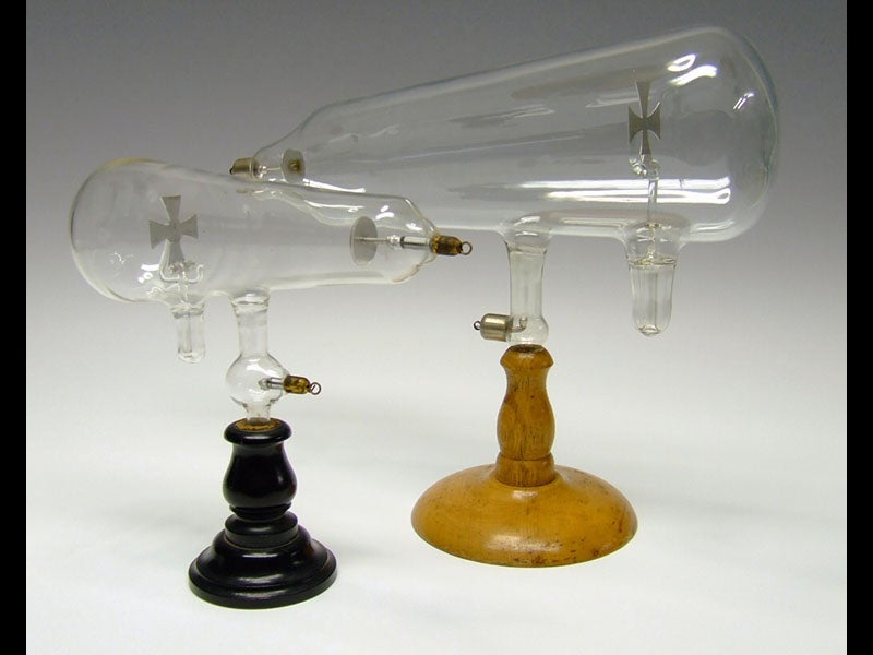 It was J. J. Thomson at the Cavendish Lab in Cambridge who, in 1897, figured out what was happening. Using a Crookes tube, and deflecting the cathode rays by a magnetic field, Thomson discovered that the cathode rays were actually very tiny particles with a negative charge. Thomson had discovered the electron. At about the same time, William Roentgen found that when the cathode rays strike the end of the tube, they produce radiation that can pass right through the tube wall. Roentgen had used the Crookes tube to discover X-rays. So Crookes’ device made quite an important contribution to what we often call the second scientific revolution, the birth of atomic physics.