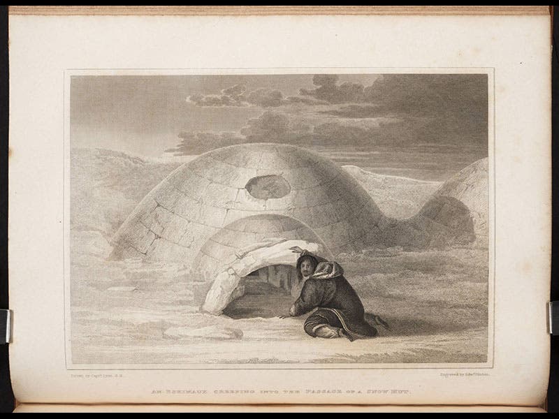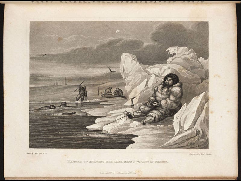 The second voyage of 1821-23 is a good example. Parry and his two ships, Hecla and Fury, were frozen in north of Hudson Bay for two years and never made it any further west. But rather than twiddling their collective thumbs in enforced idleness, Parry and his men befriended the local Inuit, whom they called Esquimaux, and made a study of their way of life, and couldn't help noticing how well the Inuit survived in an environment that the British found supremely inhospitable. Parry's Narrative (1824) is enlivened not only with his observations of the natives, but with abundant illustrations showing how the Inuit fished, hunted, and played, as the images above demonstrate.