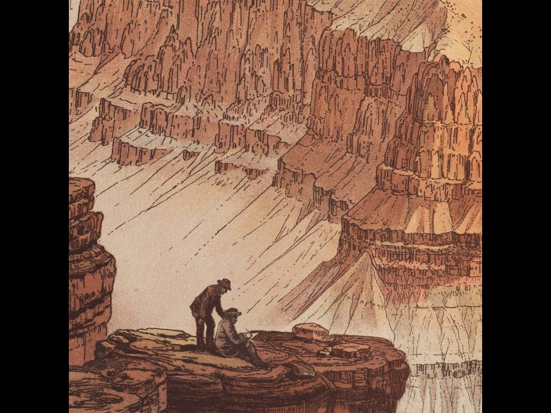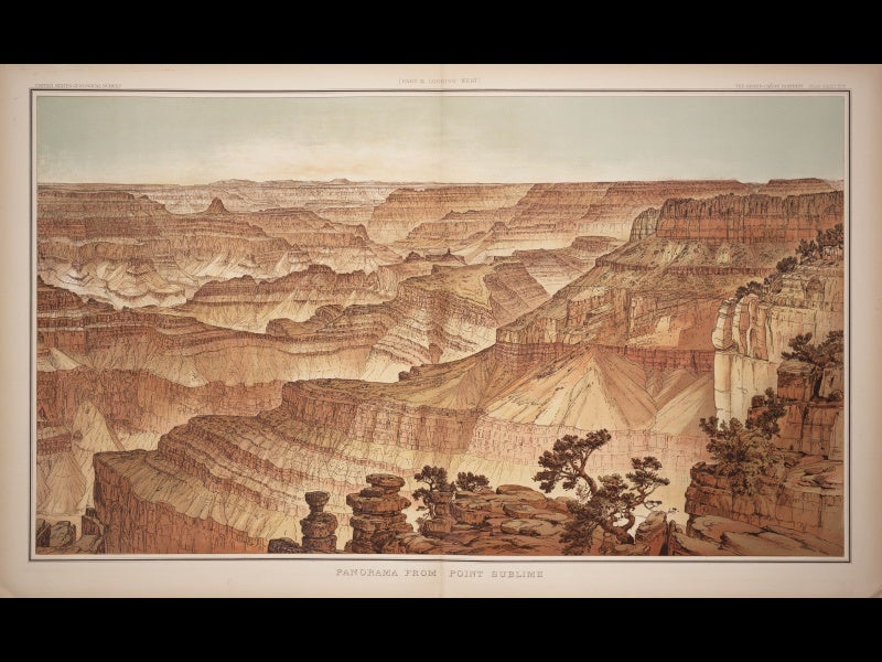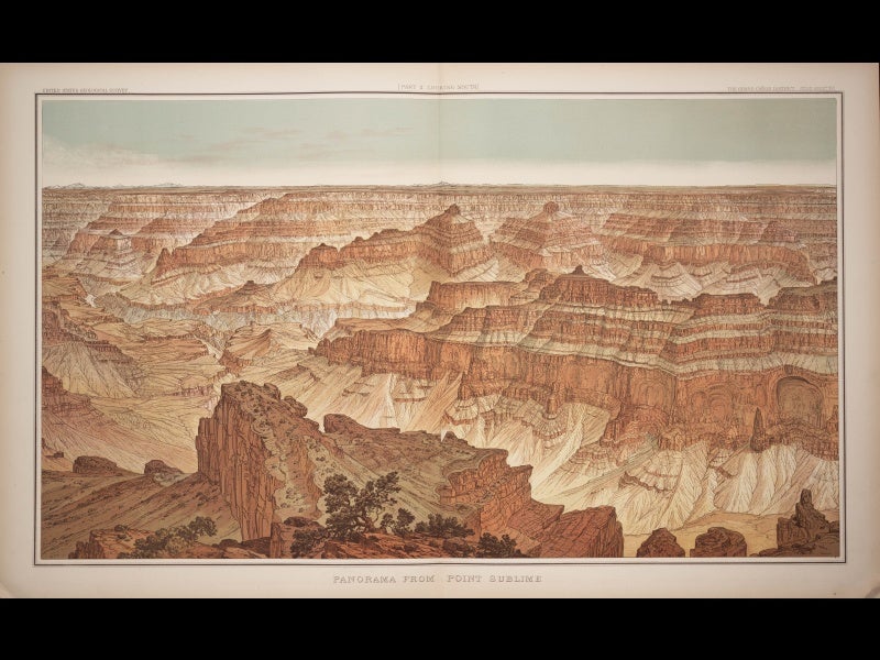William Henry Holmes, American artist, geologist, and archaeologist, was born Dec. 1, 1846. In 1872, he joined Ferdinand Hayden’s Survey of the Territories, which was exploring the Rocky Mountains and the Yellowstone area at the time. Holmes was initially employed as the survey artist, but when Hayden's project was subsumed into the U.S. Geological Survey in 1879, Holmes continued on as both artist and geologist, and he quickly became one of the country’s finest geological illustrators. He did the artwork for Clarence Dutton's Tertiary History of the Grand Canyon District (1882), which is one of the most stunning geology books ever published. Holmes’ “Panorama from Point Sublime” is probably the most famous set of plates from this atlas; the first plate shows author Dutton and artist Holmes on the job in the foreground (see first image above); two more plates complete the panorama (second and third images above). When we mounted our Science Goes West exhibition in 2004, we had the first plate on display in the entry foyer to the Library; it is a full 30 inches across and made quite a spectacular invitation to the library and the exhibition. In the detail of the first plate (fourth image above), you can see Holmes with his sketch pad at the right, with Dutton looking over his shoulder.