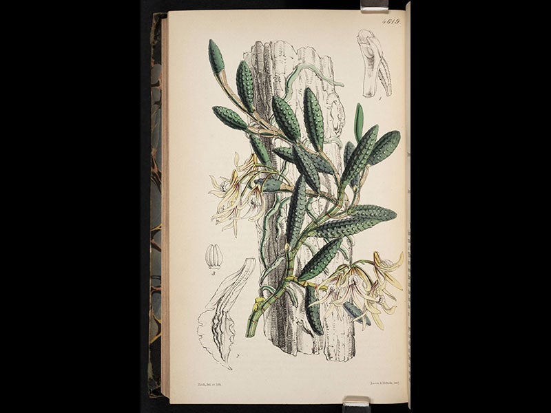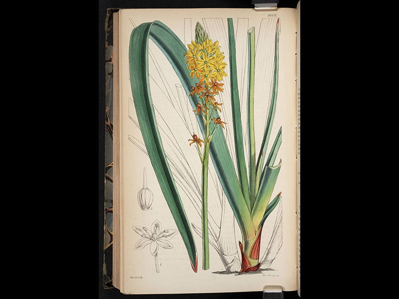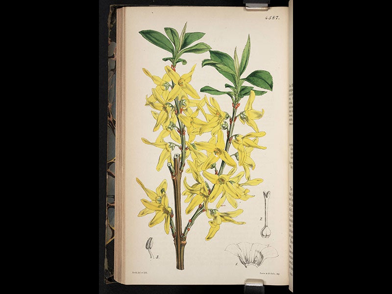 William Jackson Hooker, an English botanist, was born July 6, 1785. Hooker cut his botanical teeth on Arctic flora, as the collecting fruits from the northern voyages and expeditions of Edward Parry, William Beechey, and John Franklin were turned over to Hooker for description and publication. Then, in 1826, Hooker took over as editor of Curtis's Botanical Magazine, which each month published an issue with a number of hand-colored lithographs of flowering plants, mostly exotic ones. The artist was Walter Hood Fitch, whom Hooker personally selected as the magazine artist. Hooker continued to edit the journal, even after he was appointed Director of the Royal Gardens at Kew in 1841. On the occasion of our Grandeur of Life exhibition in 2009, celebrating the bicentennial of Darwin's birth, we digitized the images in one of the volumes of the magazine, that for 1851, and four of those lithographs are shown above, in order: an Allamanda, from Brazil; a Maori lily, from New Zealand; a forsythia, from China; and a Cucumber orchid, from Australia. Two other flowers from the same volume, a Nepalese poppy and a Royal-blue water lily, can be seen on the exhibition website.
