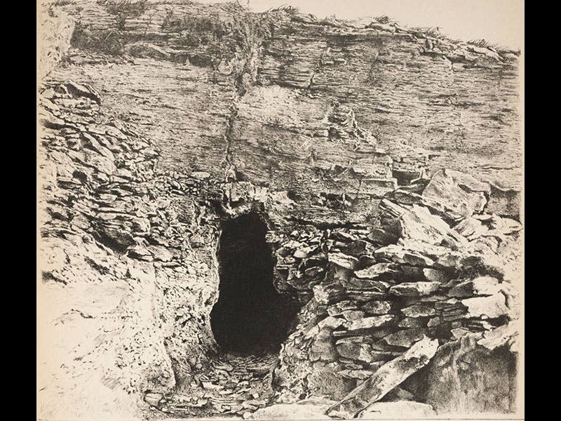 William Pengelly, a British geologist and archaeologist, was born Jan. 12, 1812. Although raised in Cornwall, Pengelly moved to Devonshire in the 1830s and began to investigate the limestone caves around Tor Bay (see map, second image). One cave, Kent's Cavern, had been excavated in the 1820s by John MacEnery, who found extinct animal bones and what appeared to be primitive stone stools all mixed together. But few people believed that such evidence demonstrated the antiquity of humans, because it was hard to prove that the tools and the animals were really there at the same time. When Pengelly learned in 1858 of an unexcavated cave, called Brixham Cave (first image), on the other side of the Bay, he did a very clever thing. He wrote to the big names in the Geological Society of London, famous geologists like Charles Lyell and Hugh Falconer, and suggested that they send down some representatives to help investigate this virgin cave. Pengelly was perfectly capable of excavating Brixham himself; what he really wanted were reliable witnesses. When the geologists arrived, and the stalagmite of the cave floor was broken through, and extinct animal bones were found below the surface (third image), along with stone tools, it was no longer possible to say that the tools were a later intrusion. The London geologists went home and reported in 1859 that there was no longer any doubt about it: humans were ancient inhabitants of the globe, and not some late arrival. It was a real turning point in archaeology and anthropology. Their initial announcement was printed immediately in the Proceedings of the Royal Society of London, but the formal paper with images of the fossils in Brixham Cave did not appear in the Philosophical Transactions until 1873. We displayed this article in our 2012 exhibition, Blade and Bone: The Discovery of Human Antiquity.