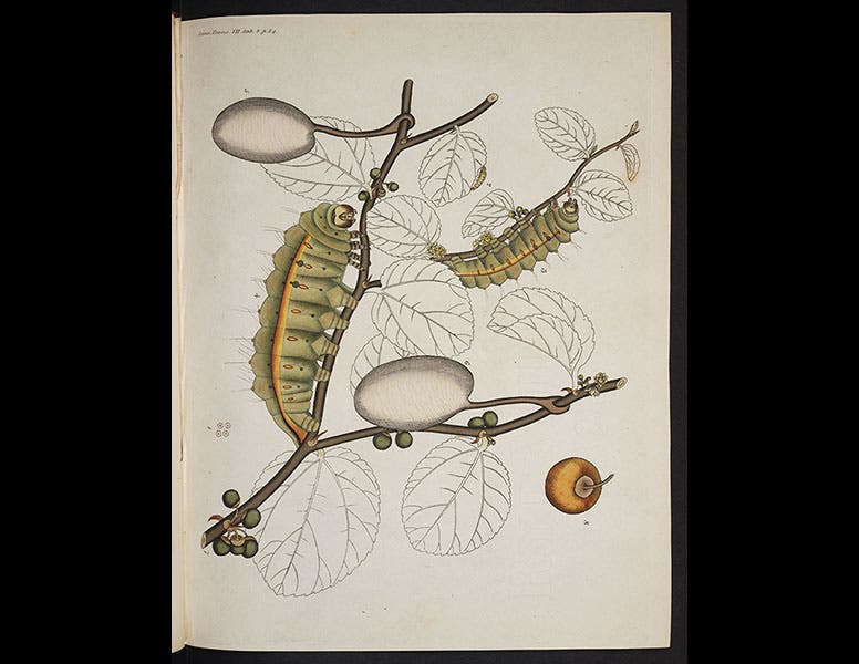 In 1793, Roxburgh was named superintendent of the East India Company’s botanic garden at Calcutta, taking over after the decease of founder Colonel Robert Kyd. Roxburgh’s tenure as superintendent has been called the beginning of the Calcutta garden’s golden age. He expanded the number of plants under cultivation and experimented with new plants, including fiber plants like flax and hemp, to reduce British dependence on imported goods. Though most of his work was in botany, he was a keen observer of other forms of life in India, particularly those with economic value. Roxburgh experimented with growing Opuntia, the host cactus for the cochineal beetle, and studied Bengal silkworms. He maintained connections with the networks of natural history in Britain and reported his findings about silk worms to the Linnean Society, which presented this work in a meeting in 1802 (first and second image).
