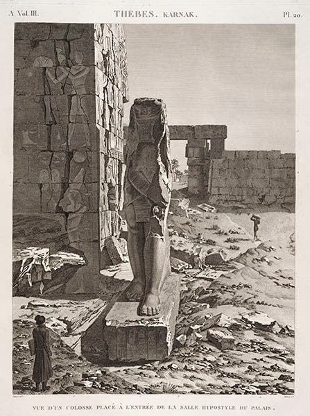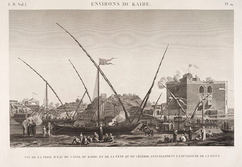 André Dutertre, a French artist, was born June 9, 1753. Dutertre accompanied Napoleon Bonaparte on his invasion of Egypt in 1798. He was supposed to be sketching irrigation machinery, glass-making factories, and canal boats (which he did, to some extent, see fifth image), but when he and the scientific corps discovered the antiquities of Egypt, there was no holding them back. Many of the engravings in the Description de l’Egypte (1809-28) were based on Dutertre drawings, such as the plates depicting the pyramids at Giza (first image), the sand-filled interior of the temple at Karnak (second image), the temple at Dendera, where the stone zodiac was found (third image), and a ruined colossus at Karnak (fourth image)--note the artist contemplating the statue, perhaps Dutertre placing himself within the scene.