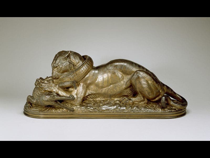 Antoine-Louis Barye, a French sculptor, was born Sep. 24, 1796. Barye was the first and foremost sculptor of the Animalier school of 19th-century Paris. Barye made large bronzes of mostly ferocious animals in a very life-like style, and he executed nearly all of the casts himself, so they are meticulous in detail and finish. He found most of his subjects in the menagerie of the Jardin des Plantes. One of his most famous pieces, Lion and Serpent, was exhibited in 1832 and is now in the Tuilleries; there is a copy in Baltimore at the Walters Art Gallery (see first image above). Another well-known piece, Tiger Devouring a Gavial, was exhibited at the Paris Salon in 1831 and is now in the Louvre; a reduced copy is also in the Walters Gallery (second image). Jaguar Devouring a Hare, ca. 1850, is a lovely bronze (third image); the Nelson-Atkins Museum here in Kansas City has the model for this piece, although it is not currently on display. And Barye’s Crouching Dog has always been a popular piece, available in much reduced versions on the bronze collectibles market (fourth image)