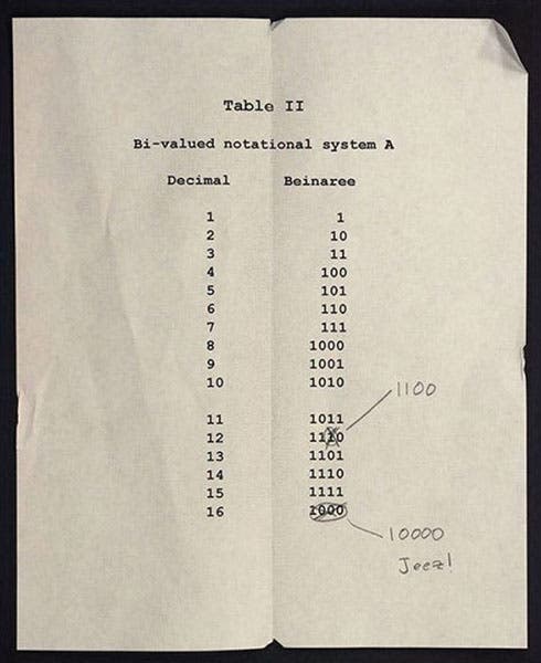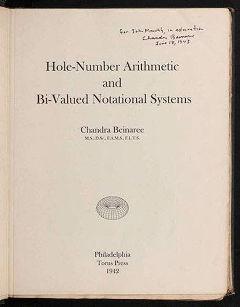 As it happened, in 1943, the US Army was designing the first digital computer, the ENIAC, and they were looking for a number system that could describe the state of thousands of vacuum tube switches, all of which were either on or off, that is, had a value of 1 or 0. The Beinaree system was just what they were looking for, and they used it to develop the ENIAC programming. The ENIAC and its new digital code were announced to the world on Feb. 15, 1946, but the Army changed the name of the operating system to the “'binary" system, perhaps to conceal its non-American origins. For a similar reason, the government appears to have bought up the complete printing of Beinaree’s book and suppressed it, making Hole-Number Arithmetic the greatest rarity in the history of computer science. Only two copies are known to exist; one is in the Linda Hall Library, a presentation copy to John Mauchly, the designer of ENIAC. The other is currently being offered for sale by the eminent New York dealer Jonathan Hill, and is a presentation copy to John von Neumann, the father of the modern computer [add link here when available]. Our copy also contains a proof sheet of a table of Beinaree numbers, laid in, which Beinaree had corrected, apparently with some exasperation (third image above).