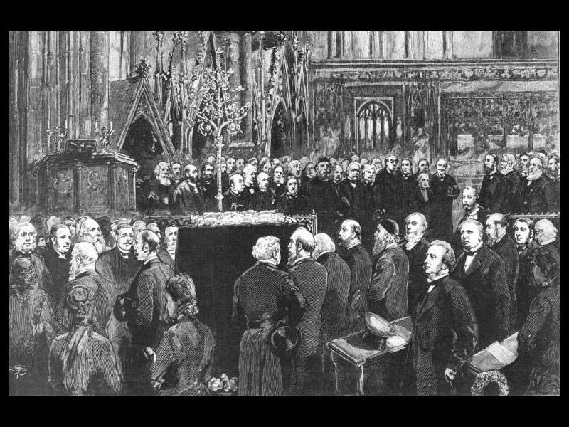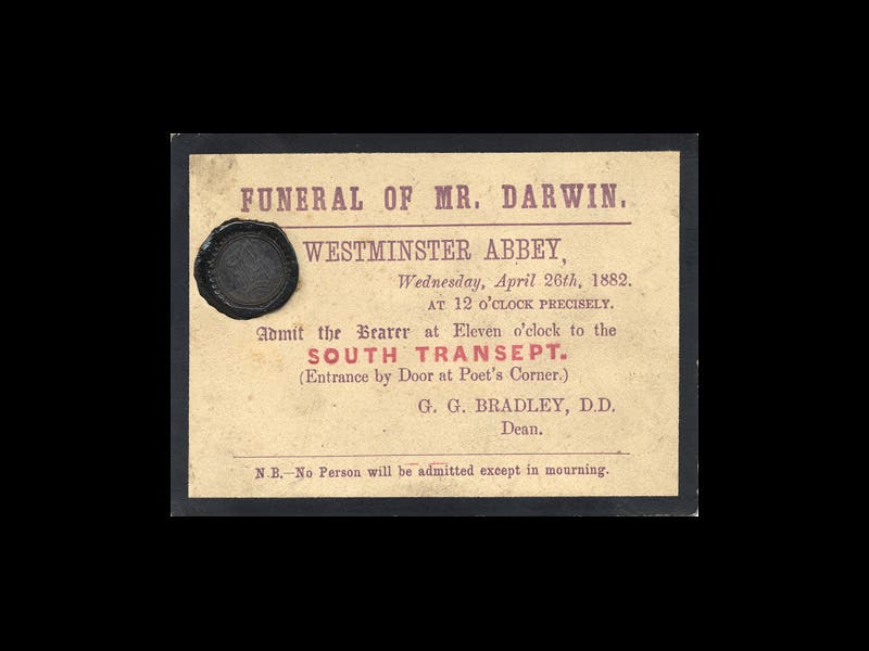 Charles Darwin was buried in Westminster Abbey on Apr. 26, 1882. He had died on Apr. 19, 1882, at his home in Downe, south of London. It is rather curious how England's most famous agnostic ended up in Westminster Abbey. The Dean of Westminster, George Bradley, received a letter from William Spottiswoode, president of the Royal Society, requesting the Westminster burial. Bradley was then in France and unable to consult with anyone, and perhaps being unaware of Darwin's religious proclivities, he at once gave his assent. The funeral was attended by thousands—you needed a ticket (and mourning dress) to get in (second image), and Darwin had one of the most illustrious set of pallbearers the Victorian era had ever seen, including Alfred Russel Wallace, Thomas Henry Huxley, Joseph Hooker, John Lubbock, and even the American poet James Russell Lowell, who was serving as U.S. ambassador to Great Britain. The wood engraving of the funeral appeared the next day in The Graphic (first image).