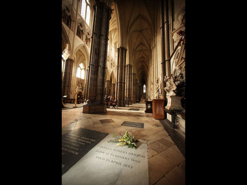 Darwin was laid to rest right next to the remains of John Herschel, one of Darwin's philosophical heroes, and just a few feet from the grave of Isaac Newton. One of the images above shows the stones of both Darwin and Herschel in the Abbey floor (third image). The map (fourth image) will help you find Darwin’s tomb if you visit Westminster Abbey—Darwin’s memorial stone is no. 2, while Herschel’s is no. 1 (and Newton’s is no. 7). Later, Darwin’s family had a bronze relief portrait installed on the north (left) wall, near his grave (fifth image).