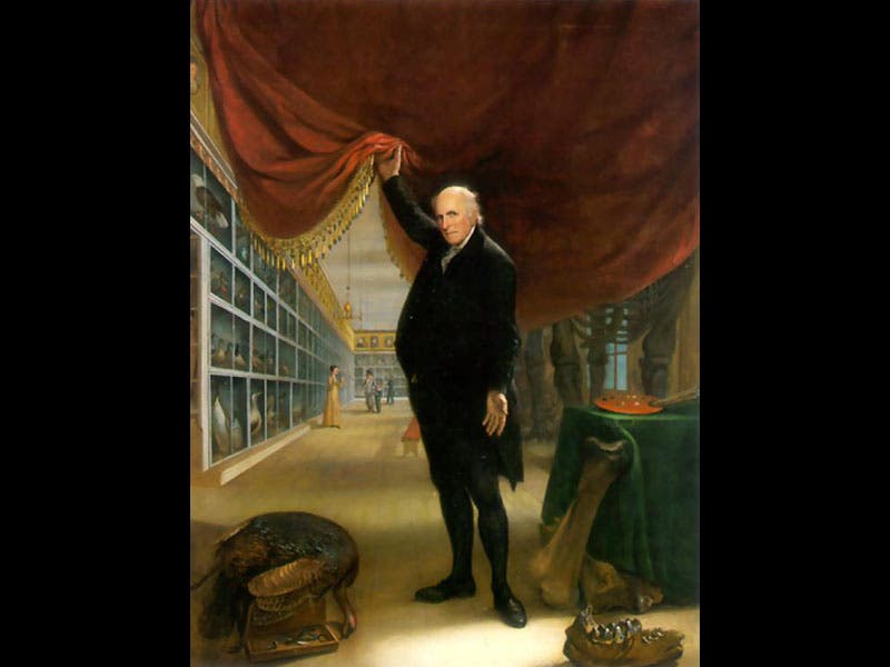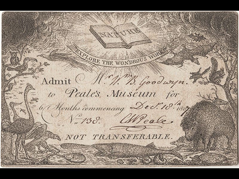 Charles Willson Peale, an American painter, died Feb. 22, 1827, at the age of 85. Around 1776, he moved to Philadelphia and set up a studio, where he painted portraits of, among others, Thomas Jefferson and George Washington. But he also collected natural objects, and in 1786, he opened a museum, Peale’s Museum, on Independence Square in Philadelphia. It was the first public museum in the United States. You can get a glimpse of its contents in this self-portrait of Peale, painted in 1822 (second image above). Several original admission tickets to the Museum, signed by Peale, survive (third image).