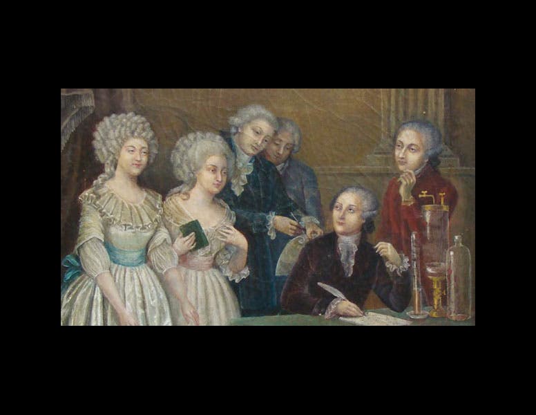 There exists a charming 19th-century painting that shows a Parisian salon in action (first image). It was no doubt inspired by Jacques-Louis David’s double-portrait of Antoine Lavoisier and his wife Marie (1788), which is in the Met, since the figures of Antoine Lavoisier and Marie here are taken directly from David's painting (Antoine is seated, Madame Lavoisier at far left). But the Guyton de Morveau's have been added in; Louis-Bernard is on the far right, and Claudine is second from the left, holding a book (which she no doubt translated). Although it is an unlikely scene (Lavoisier went to the guillotine in 1794; the Guyton de Morveau's married in 1798), it still allows Claudine to shake off some of the anonymity that has surrounded her for so many years.