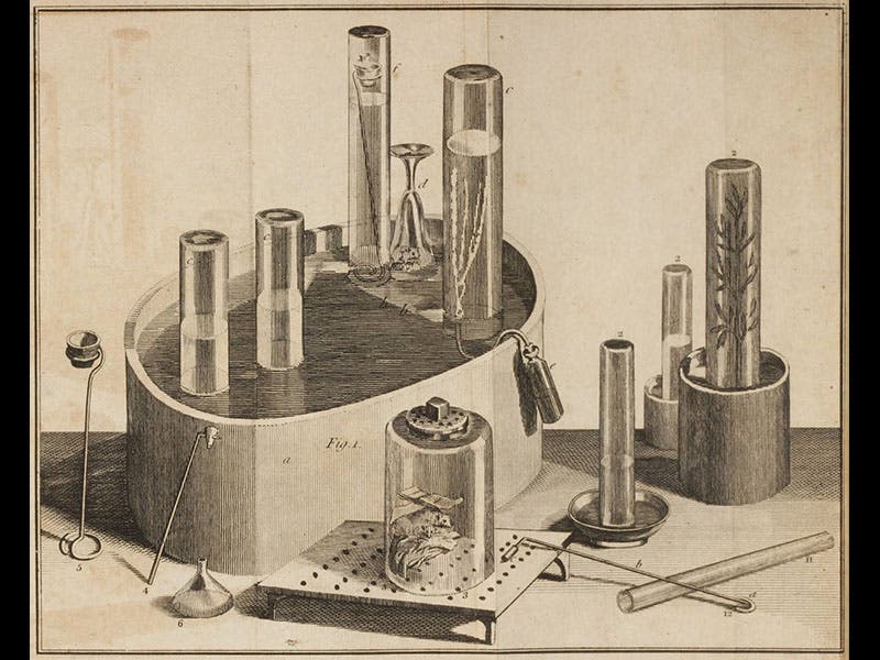 Rutherford’s portrait was painted by the great Scottish portrait painter, Sir Henry Raeburn, but only engravings of the portrait survive; the one above is in the National Portrait Gallery, London (second image). Raeburn also did an oil portrait of Scott, which is in the National Museums of Scotland (third image). Rutherford did not illustrate his laboratory equipment, so we show a diagram of a set of “pneumatic troughs” (apparatus for capturing gases over water), from a treatise on air (1777) by Joseph Priestley (first image).