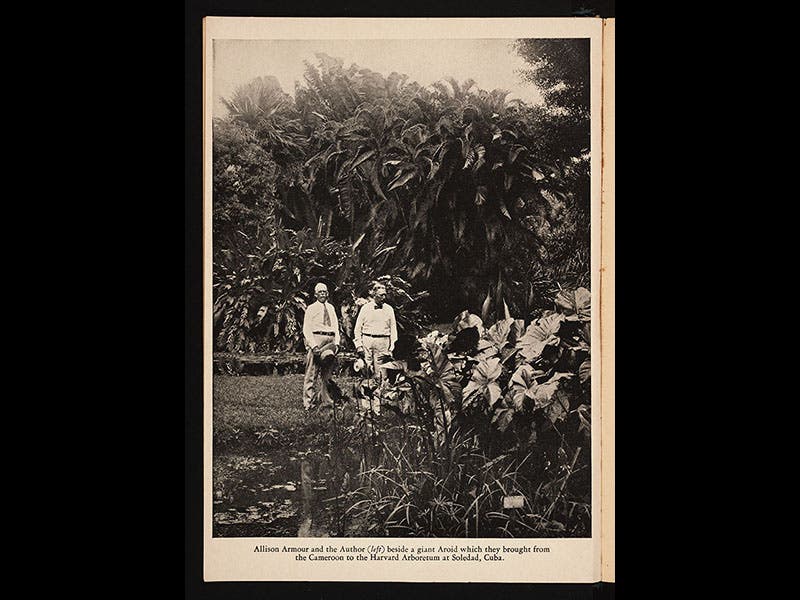Perhaps Fairchild's most glamorous import was a stock of 1000 flowering cherry trees that he bought from a Japanese nursery in 1906 and planted on his own estate in Maryland (third image). Several people had been clamoring for the city of Washington to plant cherry trees on its open avenues to dress up the city, but no one paid any attention until Fairchild showed how beautiful cherry trees could be in the spring. He took an active role in promoting the flowering cherry tree as an ornamental, and in 1912, Washington finally planted its famous cherry trees, a gift from the Japanese Embassy (first image). Fairchild should have a statue somewhere among the capital's cherry trees, but I don't think he does. Perhaps that is why he moved to Florida in 1928 and lived out the rest of his days on a seaside estate adorned with hundreds of exotic plants that he had imported from around the world, and where he wrote three popular books about the pleasures of botanical travel, all of which we have in the Library. The first of these was The World Was My Garden; Travels of a Plant Explorer (1938) (fifth image), which is the source for the photo of his wife Marian among the cherry trees at their Chevy Chase estate (third image), and the photo of an older Fairchild (on the left) with some arums imported for the Arnold Arboretum (sixth image).