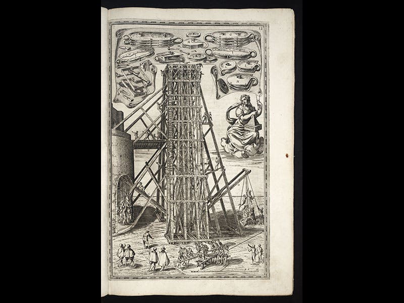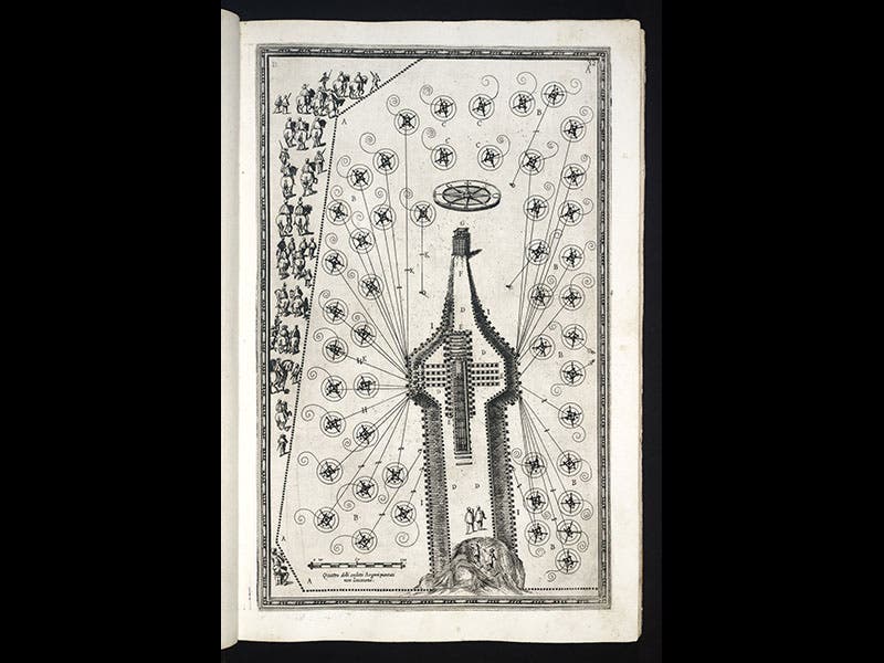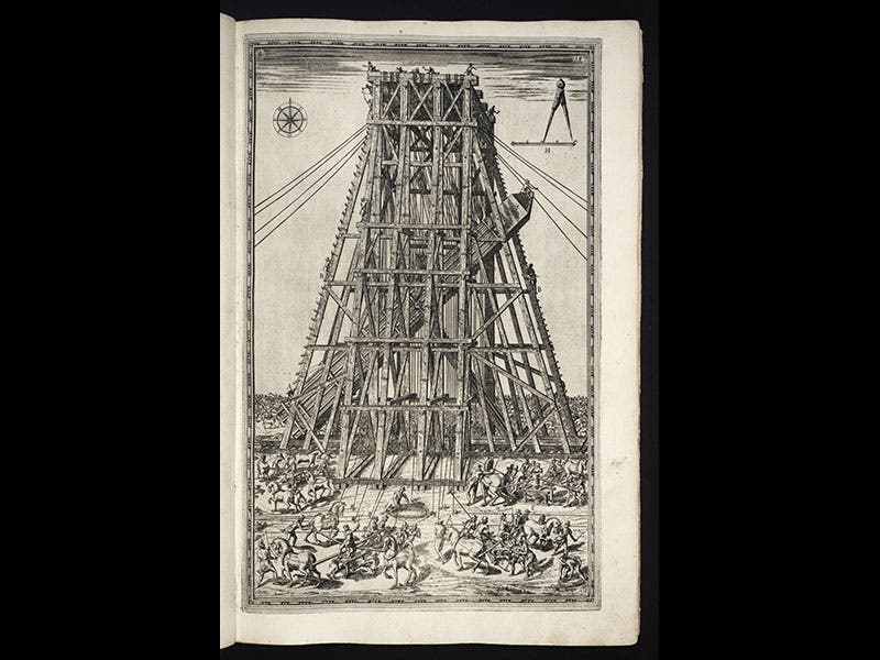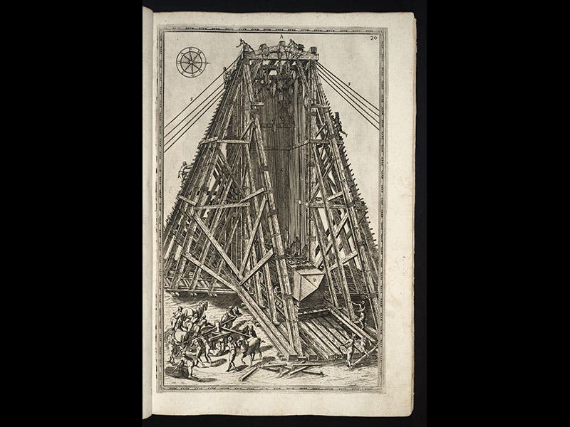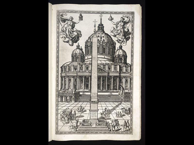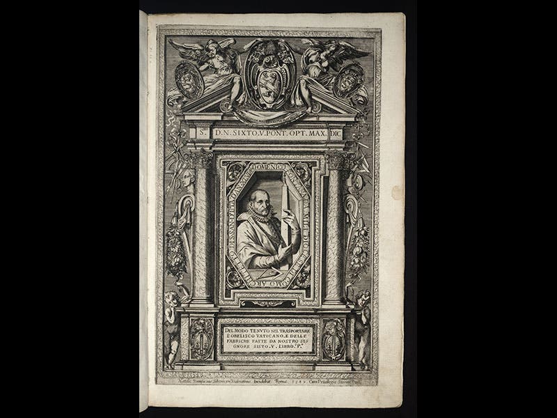 The operation took almost a year (with time off, Italian style, during the summer), and on Sept 28, 1586, the scaffolding was removed and the obelisk stood successfully on its pedestal at the location where it still rests, in the center of St. Peter's Square. Fontana's feat has ever since been acclaimed as one of the great engineering triumphs of the Renaissance. Part of the reason for the accolades no doubt stems from the fact that Fontana documented the enterprise in a splendid book, Della trasportatione dell'obelisco vaticano (On the Transportation of the Vatican Obelisk, 1590), which we have in our Collections. The work contains 12 full-page engravings that record every stage of the move; we show five of them above, in chronological order. The book also displays a frontispiece portrait of Fontana (sixth image).