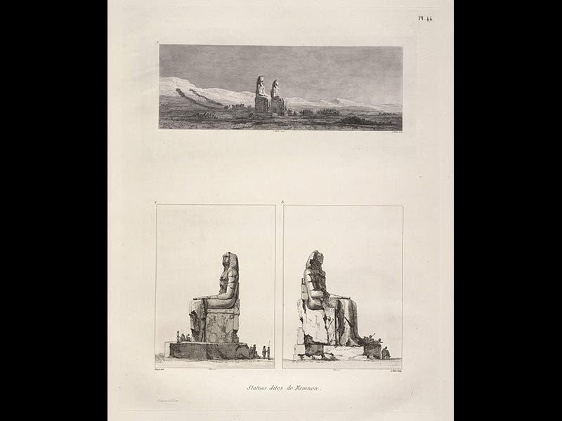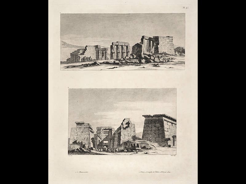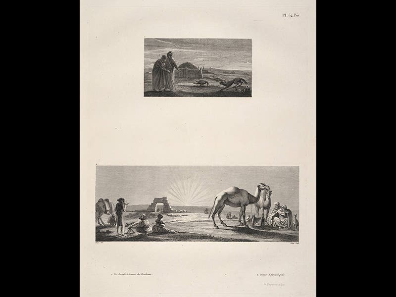 Denon himself headed back to Paris, where he soon published his Voyage dans la Basse et la Haute Egypte, pendant les campagnes du general Bonaparte (Voyage into Upper and Lower Egypt, 1802), which provided a first look at the wonders of Egypt for the public (the official publication of the expedition, Description de l'Egypte, would not begin to appear until 1809, and many of the plate volumes illustrating the antiquities would not be published until the 1820s). Denon himself was given directorship of the Louvre, or the Musée Napoleon, as it was then called, which he proceeded to fatten with the spoils of Napoleon's marauding through Europe, especially Italy. We have the original edition of Denon's Voyage in the History of Science Collection; it was displayed as part of our 2006 exhibition, Napoleon and the Scientific Expedition to Egypt.