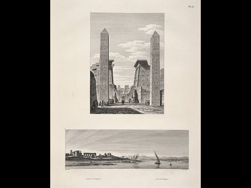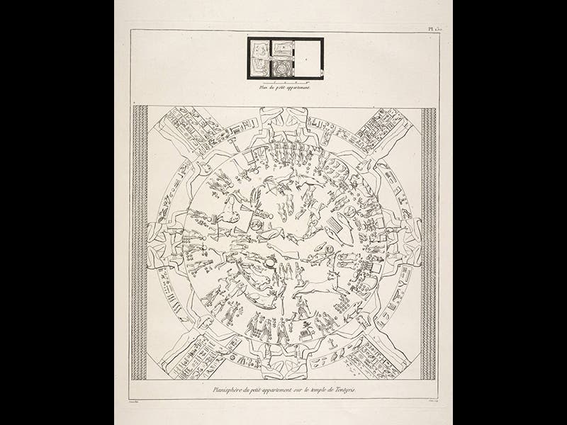 Dominique-Vivant Denon, a French artist, died Apr. 27, 1825. Denon was a socially-fashionable artist who survived the French Revolution and befriended Napoleon and was invited to come along when Napoleon invaded Egypt with his coterie of scientists in 1798. When Napoleon sent his first military force up the Nile to chase down the Mameluke opposition, Denon was the one artist who went along. Denon was thus the first to see the ancient wonders of Thebes, Edfu, and Philae, and it was Denon who discovered the ancient zodiac in a temple at Dendera (see third image above) that would later so enthrall the astronomers back home. He sketched as rapidly as he could, since the troops were constantly on the move, and when he arrived back in Cairo, and revealed what he had seen, Napoleon immediately dispatched many of his young topographical engineers to survey in depth what Denon had only glimpsed.