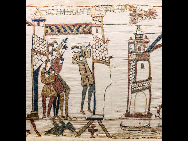 Comet Halley has returned three times since, in 1835, 1911, and 1986, and is next due back in 2061. There are not nearly as many pictorial records as there should be of past visits of Comet Halley; we see above a fairly undramatic photograph of the near approach of 1910 (third image). But two early appearances have spectacular visual records. Comet Halley appeared in 1066, when William the Conqueror was invading England, and the Bayeux tapestry has this appearance woven into its historical record (first image). And in 1305, painting a Visitation of the Magi for the Scrovegni Chapel in Padua, Giotto chose to substitute the comet for the Star of Bethlehem (fourth image).