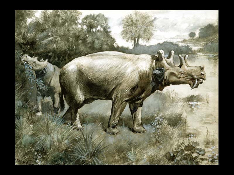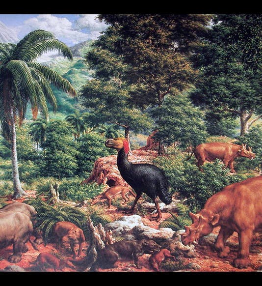 Edward Drinker Cope, an American paleontologist, was born July 28, 1840. Cope worked in Philadelphia, usually in cooperation with the Academy of Natural Sciences, and he was one of the first great vertebrate fossil collectors in the United States, as well as a life-long rival of the other great bone hunter of the period, Othniel Marsh, who taught at Yale. Most short accounts of Cope focus on the "Bone Wars" between Cope and Marsh, and they were pretty spectacular, or on Cope's dinosaur discoveries, but today we will look at another facet of his career, his discovery, description, and naming of extinct American mammals. We begin by showing a detail of Rudolph Zallinger's mural, the Age of Mammals (1967) in the Yale Peabody Museum of Natural History (first image). This section portrays a number of Eocene mammals: a six-horned Uintatherium in the right foreground, a short-legged carnivorous Mesonyx at bottom center, about to dine on an expired Hyracotherium (Eohippus), with a four-horned hippo-like animal, Eobasileus, in the near distance, and a gigantic terror bird, Diatryma, ruling the roost. Bear in mind that this mural is at the museum founded by Marsh and his uncle, George Peabody, where Cope's discoveries and names were decidedly unwelcome. It is startling then to realize that all but one of the animals mentioned and portrayed here were discovered and named by Cope between 1872 and 1875, the exception being the Uintatherium, which was discovered by Cope's mentor, Joseph Leidy. We see another reconstruction of Cope's Eobasileus in a painting by Charles Knight , who knew Cope well (second image).