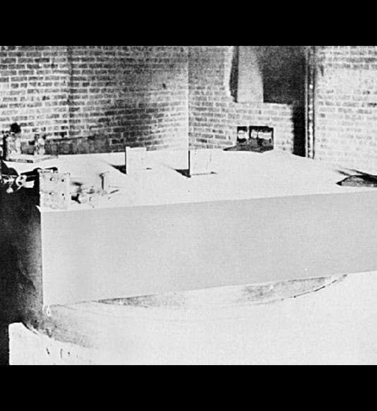 Edward Morley, an American chemist, was born Jan. 29, 1838. His name is familiar to most scientists as the hind member of the Michelson-Morley experiment, the most famous failed experiment in history. Albert Michelson was a physicist at the Case School of Applied Science in Cleveland, where he met Morley, who taught chemistry at Western Reserve University, also in Cleveland. They were interested in trying to measure the speed of the earth through the "luminiferous ether," a medium, thought to pervade the entire universe, through which light waves "waved" (just as air provides the medium for sound waves, and rock for seismic waves). If the ether fills the universe, then the earth must move through it, and the experiment was designed to detect this motion, sometimes called the “ether drift”. Carried out in 1887, it involved sending light-waves out in two perpendicular directions, reflecting them back, allowing them to interfere with one another to produce interference fringes, and then slowly rotating the apparatus 90º and measuring how much the fringes changed as the direction of the ether drift changed. You can see a photograph of the apparatus above, mounted on a large stone slab that rotated in a tub of mercury (see first image), as well as a diagram of the setup of the interferometer (second image), and a diagram of the light paths that produce the interference fringes (third image).