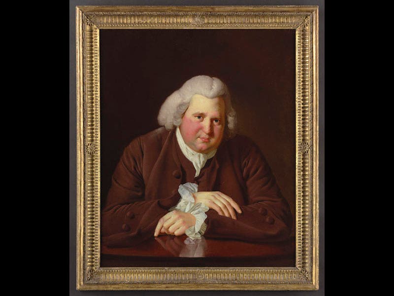 One of Erasmus' early patients was the painter Joseph Wright, who is sometimes called the first of the English Romantic painters. In 1770, Wright did a portrait of Erasmus, probably in exchange for medical services; there is a copy in the National Portrait Gallery, but one of the two originals was recently acquired by the Birmingham Museum and Art Gallery and is now on display there (fourth image above).
