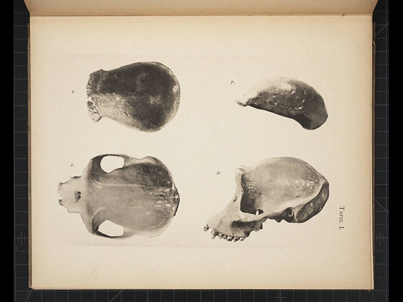 In 1891, at a site named Trinil in central Java, Dubois found a human tooth, a human-like femur, and a human-like skullcap. The femur was smaller than, but otherwise not that different from, a modern human's, but the skullcap was flat and shallow, with a much smaller cranial capacity than a modern human skull. Dubois called it "Pithecanthropus", after the name proposed by Haeckel for his hypothetical ancestor, and added the specific name "erectus." Being quite a mouthful, Pithecanthropus erectus quickly became "Java man" in the popular press. We now recognize Java man as the first discovered specimen of Homo erectus. Current thinking is that Homo erectus, although a very successful and wide-spread species, was not ancestral to Homo sapiens. We have Dubois’s book of 1894, Pithecanthropus Erectus, in the History of Science Collection, and we displayed it in our 2012 exhibition, Blade and Bone: The Discovery of Human Antiquity, along with a plate from a Smithsonian Institution Report of 1898 that announced the discovery to a U.S. audience.