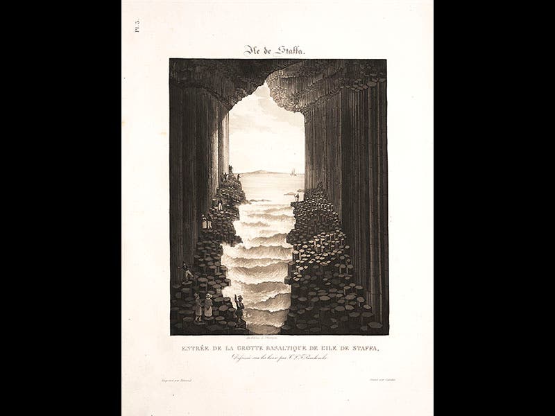 Felix Mendelssohn, the German composer, was born Feb. 3, 1809. In 1829, during a tour of Scotland, Mendelssohn visited Fingal's Cave on the island of Staffa, in the Hebrides, and was immediately inspired to write a short overture, The Hebrides. The cave had become quite a tourist attraction in the fifty years since its discovery by Sir Joseph Banks in 1772. The island of Staffa is composed entirely of columnar basalt, and the cave, hewn out by the sea, is therefore a cathedral of immense six-sided columns of rock, with basalt prisms hanging down from the ceiling like huge chandeliers. The cave was often pictured in geology books of Mendelssohn's time, since the origin of basalt was highly debated, some thinking that it had a volcanic origin, others that it was a sedimentary rock. We see above four illustrations—an engraving, two aquatints, and a lithograph—of Fingal’s cave, from works in our History of Science Collection, dating from, in order, 1774, 1800, 1819, and 1831. The first one was featured in our 2004 exhibition, Vulcan’s Forge and Fingal’s Cave.