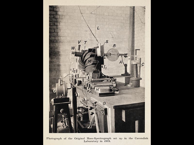 Francis William Aston, an English chemist turned physicist, was born Sep. 1, 1877. Aston was at the Cavendish Lab in Cambridge in 1913 when his boss, J. J. Thomson, discovered that the element neon seemed to have two different atomic weights, one about 20 times as heavy as hydrogen, and the other about 22 times heavier. These came to be called isotopes, and it was suspected that other elements had different isotopes as well, but there was no easy way to separate them and determine their atomic weights. In 1919, Aston invented the mass spectrograph (second image). This instrument takes ions boiled off a cathode and sends them through a magnetic field, which bends the ion stream into a loop. If several isotopes are present, then the heavier isotope will be curved less, and the ion stream will be divided into two (or more) parts, which will then produce two (or more) spots on a photographic plate, revealing the existence and, if done precisely, the atomic weights of the isotopes.