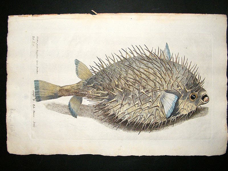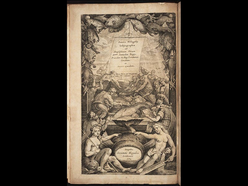 The History of Fish is somewhat notorious because it was a very expensive publication, with many large copper plates, and the coffers of the Royal Society treasury were emptied by its production. And since the book sold very poorly, the coffers remained empty. So when, later that year, Edmond Halley came to the officers of the Society with a request to finance what he thought would be an important book, he was turned away. The book was Isaac Newton's Principia. Fortunately, Halley himself agreed to pay for the publication of Newton’s great work, and Willughby's De historia piscium was not forever cursed as the book that killed the gold-bearing goose. We have both of Willughby's posthumous volumes in the History of Science Collection. The engraved title page from the History of Fish (fifth image) is from the copy in our collection, but as our plates have not been digitized, the porcupine fish is from another copy (sixth image).