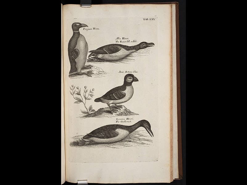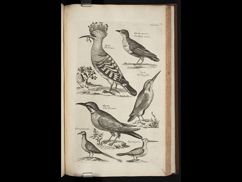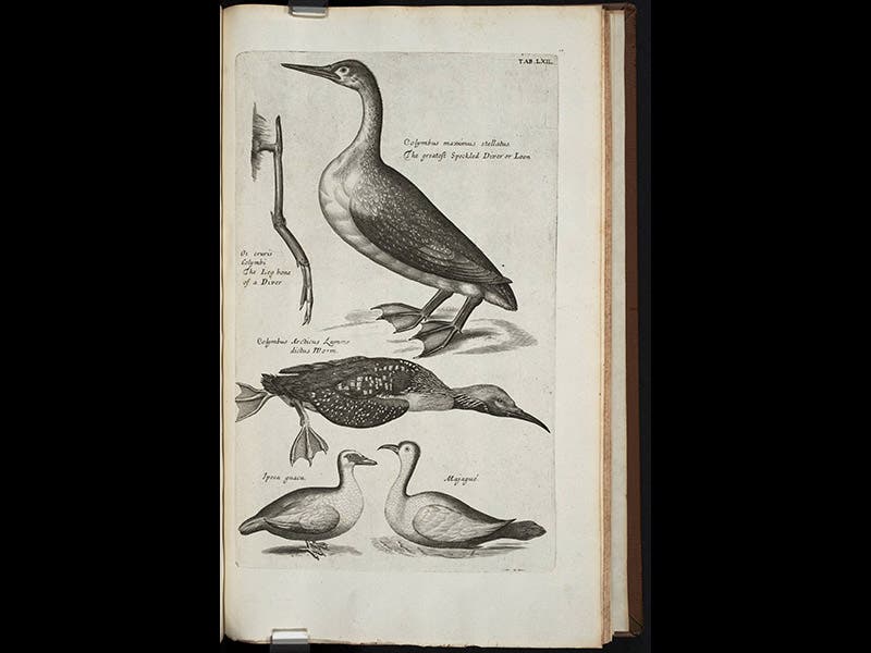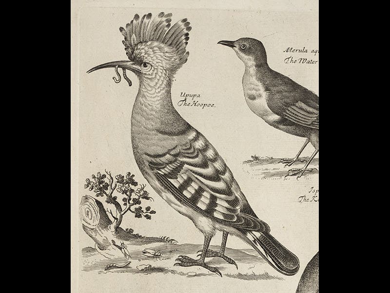 For the illustrations in the bird volume, Ray used whatever he could find or were supplied by correspondents; the hoopoe is quite handsome (first and fourth image), as is the standing loon (second image); the horizontal loon was taken from Ole Worm’s museum book, and the dead razor-billed auk and guillemot (third image) were supplied by Thomas Browne, who refused to pretend the birds being drawn were still alive.