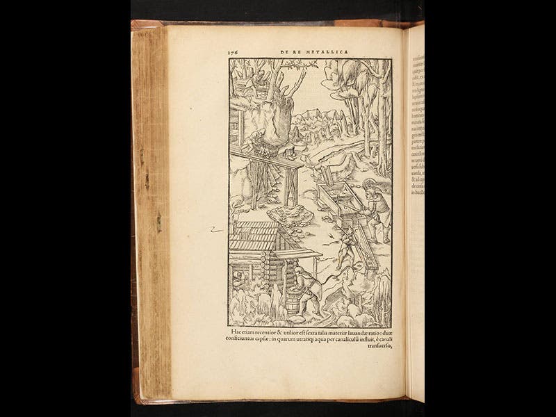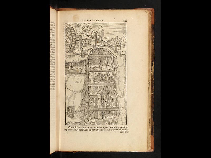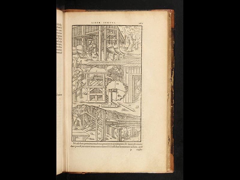 Georg Agricola, a German mining engineer, was born Mar. 24, 1494. In 1556, four months after his death, Agricola’s master work was published by the venerable Swiss publishing firm of Froben and Son. The book was called De re metallica--On Metallic Things--and it is essentially an encyclopedia of mining practices and metallurgical techniques. More importantly, it is a visual encyclopedia, graced with almost 300 illustrations, commissioned by Agricola and turned into woodcuts by Froben's craftsmen. The woodcuts show how to find metal-bearing veins (second image above), , how to pump mine shafts free of water (third image), how to construct waterwheels and hoists and hand-trucks, how to aerate mines with bellows (fourth image), and how to extract metals from ores, the extraction process being different for silver, copper, iron, and tin (fifth image). What is most impressive about these images, however, is the way Agricola and his artist created new pictorial conventions to help the viewer understand the intricacies of mine construction. Consider for example the first image above; it shows a mine-shaft cut away to reveal a water pump, with two pipes going down and one up, operated by a man turning a crank. These days we take cut-away drawings for granted, but in 1556 they were a complete novelty, a clever way to allow the viewer to peek inside a mine and yet still see the external structure. To help us understand what is in the wooden box that the cranksman operates, Agricola takes that apart, twice, once at the upper right, when the exterior is made invisible so we can see the crank and the two piston tubes inside, and again at the bottom, where the box is physically dismantled so we can see its construction