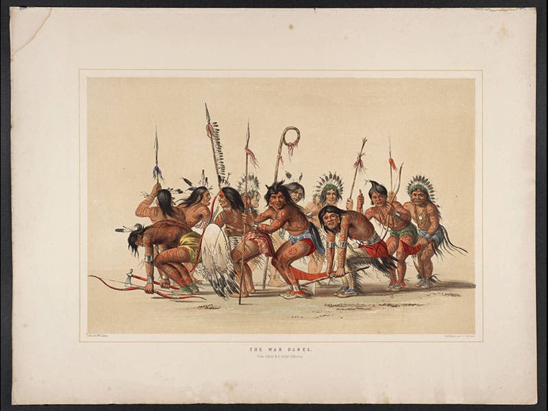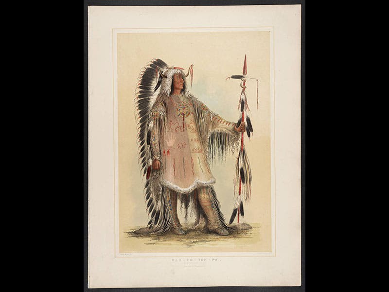 In 1844, Catlin had published a small selection of his paintings as prints, in what he called the North American Indian Portfolio. We have this portfolio in the History of Science Collection, and for our Science Goes West exhibition in 2004, all thirty-one plates were displayed, mounted on the walls of the old exhibit room. They provided a very dramatic "surround" for the other books on display. Five of these can be seen above. At the time of our exhibit, many of the original Catlin oils were at the nearby Nelson Gallery, as part of a national tour. You can see a selection of these at a Smithsonian virtual exhibition. The portrait of Catlin (sixth image) is also at the Smithsonian, in the National Portrait Gallery