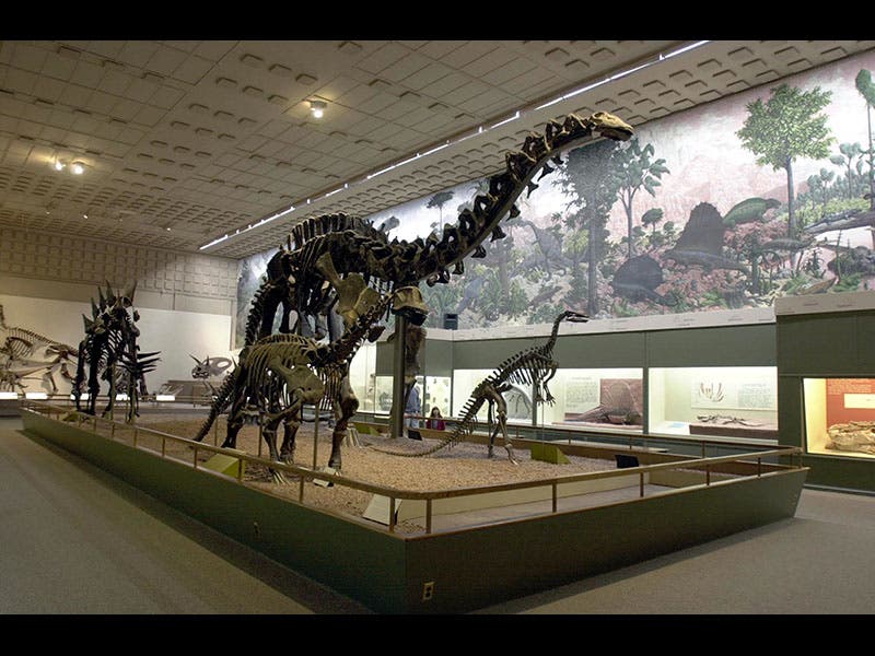 But the building financed by Peabody that justifies his inclusion in a scientific anniversaries series is the Peabody Museum of Natural History at Yale University in New Haven, Connecticut. Peabody's nephew, Othniel Charles Marsh, was a budding paleontologist at Yale, and he convinced his uncle to contribute $150,000 to establish a natural history museum there. The bequest was made in 1866, the first museum was opened in 1876, and the present building was dedicated in 1925 (second image). The new Peabody Museum was built with a special hall just for dinosaurs (Marsh's specialty), and its long front wall proved to be just the spot for the most famous dinosaur painting in history, The Age of Reptiles, executed in fresco by Rudolph Zallinger and completed in 1947 (third image). The Museum is well worth a visit, not only for the fresco, which is stunning, but also for the dinosaur skeletons. You can see there the first Brontosaurus ever excavated (by Marsh, visible in the foreground of the photo of the mural), as well as the first Deinonychus, the feisty little theropod, discovered in 1964, that revolutionized our ideas about how dinosaurs lived and moved, and which inspired the 1993 film Jurassic Park (fourth image).