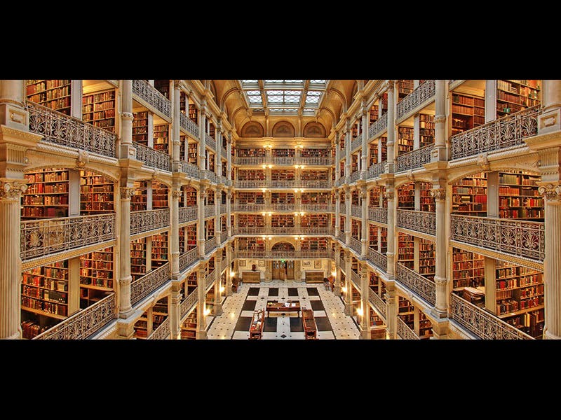 George Peabody, an American financier and philanthropist, died Nov. 4, 1869, at the age of 74. Peabody made much of his fortune in Baltimore; then he moved to London in 1837, where he made even more money, and where he would live for the rest of his life. In the 1860s, he started giving his money away, first to the poor of London, and then to help establish educational institutions in the United States. He founded the Peabody Institute, a conservatory, in Baltimore in 1866, and in 1878 the George Peabody Library was added to the Institute; the Peabody Library has one of the most beautiful library interiors in the world, with its wonderful cast-iron tiers of book stacks and its lofty skylights (first image).
