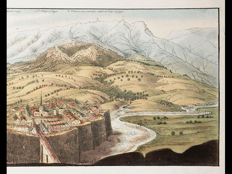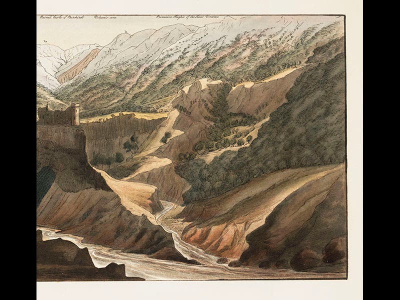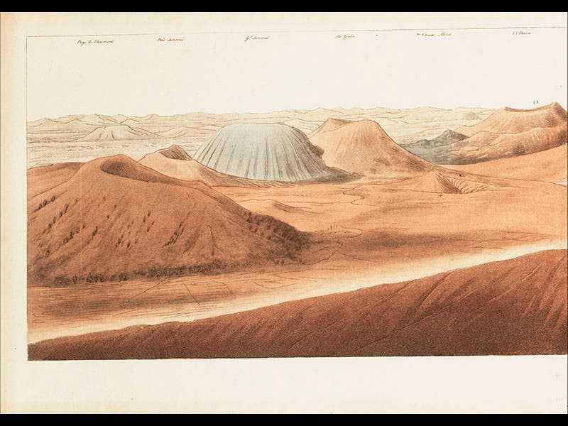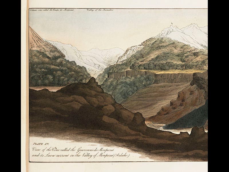 George Poulett Scrope, an English geologist, was born Mar. 10, 1797. In the early 1820s, Scrope visited the mountainous region of south-central France, which included areas known as the Auvergne, the Velay, and the Vivarais. Fifty years earlier, French geologist Nicolas Demarest had revealed that the mountains of the Auvergne were actually extinct volcanos, and Scrope wanted to see for himself. He found that Desmarest was right--there was basalt everywhere, hundreds of feet of it in distinct layers, all apparently disgorged from volcanoes now long extinct. He published a book on the region in 1827, called Memoir on the Geology of Central France; it took five years to publish because of the elaborate folding hand-colored panoramic engravings that he included in the volume of plates. We see three of the plates here; the first shows the region of the Auvergne that includes the Puy de Dôme, the tallest mountain (and extinct volcano) in the region (see first and second images above). The second folding plate depicts an area to the east, in the Vivarais, near the city of Jaujac, where they are thick layers of basalt criss-crossing one another that were subsequently eroded by a river (images three, four, and five above are from this one plate). The third panorama shows an area near Le Puy en Velay, where a lone monastery sits atop a basalt puy or butte (sixth and seventh images).