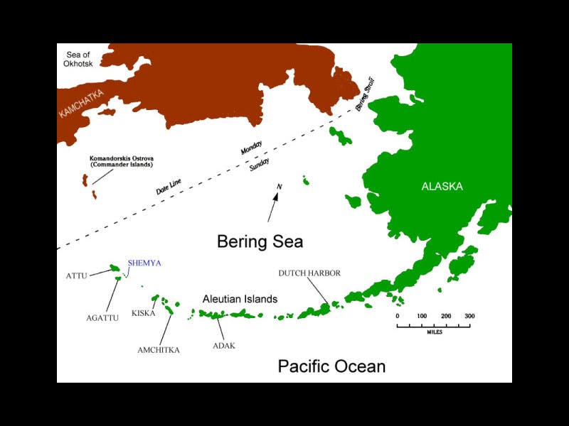 But back to Bering and Steller. On the return voyage, the crew was stranded on Bering Island, in the Commander Chain in the Bering Sea, where they had to overwinter, and most of the crew, including Commander Bering, died of scurvy. But Steller took the opportunity, if that is what it was, to study the animal life, and he was the first to observe the remarkable sea cow now known as Steller's sea cow. It stretched nearly twenty-five feet long, was quite peaceful, and fed on kelp. There is no illustration of Steller’s sea cow in the Fauna Boreali-Americana because, within thirty years of discovery, it had been hunted to extinction. The best we can do is show you a skeleton that has been preserved in the Finnish Museum of Natural History (second image). The Commander Islands are shown on this map (just above the date line) although Bering Island is not marked (third image)