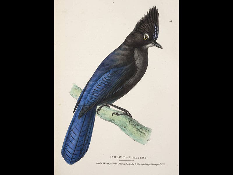 George Steller, a German zoologist and explorer, was born Mar. 10, 1709. Steller moved from Germany to St. Petersburg, and from there he joined the second exploring expedition of Vitus Bering in 1740. The Bering expedition made its way to the Kamchatka peninsula on the Pacific Coast of Russia, and then, in 1741, to Alaska. Steller was the first naturalist to explore the Alaskan coast, where he observed, among other things, a bright blue jay with a black head that would later be named after him, Steller's jay (first image). The image is from a book in our collection, Fauna Boreali-Americana (1829-37), by John Richardson; the bird volume of this set contains hand-colored lithographs by William Swainson.
