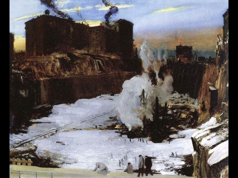 George Wesley Bellows, an American painter, died Jan. 8, 1925, at age 43. Bellows was just 20 years old when Alexander Cassat, president of the Pennsylvania railroad (and brother of painter Mary Cassat), decided it was high time that his trains found a way to get into New York City, rather than terminating in New Jersey on the west bank of the Hudson river. Eight years later there were two long tunnels under the river and a mammoth station, Pennsylvania Station, had arisen on two city blocks between 31st and 33rd street. The project was the largest engineering endeavor ever undertaken in the United States, and most of the labor and expense went into excavating an enormous cavity to allow the tracks from under-river tunnels to connect with the land lines. Bellows arrived in New York from Columbus, Ohio in 1904, when the digging was just underway, and he must have watched this process in awe for several years before deciding to try to capture the digging effort on canvas. He made four paintings of the excavation. The first, called Pennsylvania Excavation (1907), was given to the Smith College Museum of Art a few years ago (second image above). The second, Excavation at Night (1908), is in the Crystal Bridges Museum in Bentonville, Arkansas (first image). The third, Pennsylvania Station Excavation (1907-09), is in the Brooklyn Museum of Art (third image). And the last, Blue Morning, is in the National Gallery of Art (fourth image). The Brooklyn Museum and the Crystal Bridges paintings are the most dramatic, with Excavation at Night impressively so, with the fires and lamplights unable to penetrate the sheer vastness of the audacious hole in the ground.