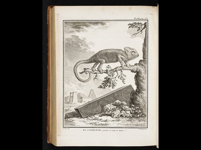 The first four images above are from the first quarto edition (1749-1804) and depict, in order: a chameleon, an owl, Clara the rhino, and a 9-banded armadillo. The last two images are from the Deux-ponts edition (1785-91) and show the title page with Buffon’s portrait opposite, and a plate with several species of sloths.