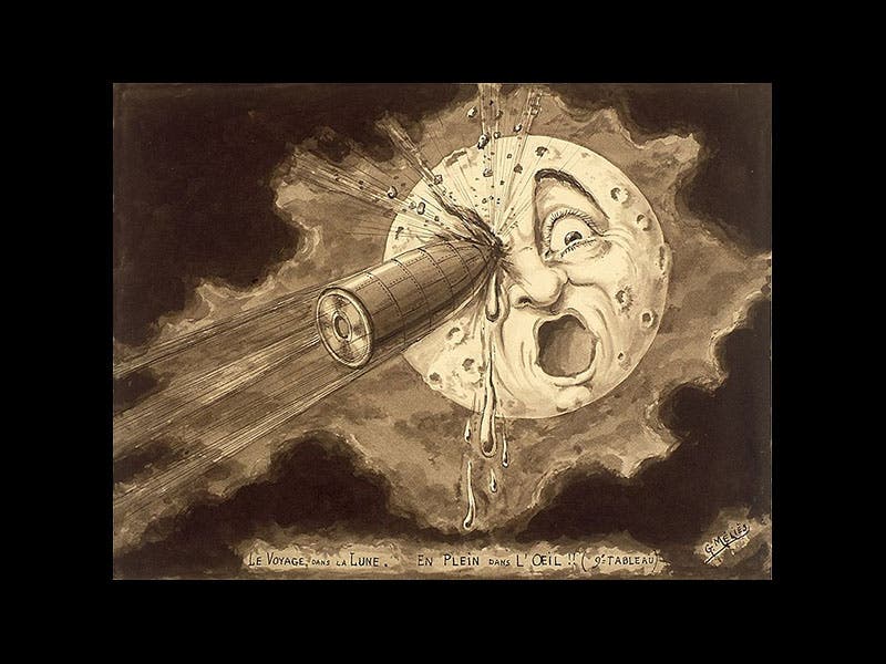 Méliès earns a place in this column because of two particular films he produced: Le voyage dans la lune (A Trip to the Moon, 1902), and Voyage à travers l'impossible (The Impossible Voyage, 1904). A Trip to the Moon is the more notable, because it was first, and therefore was the first science fiction film ever made (The Impossible Voyage was the second). The plot, such as there is, was drawn from Jules Verne’s From the Earth to the Moon, but in fact the film is basically just a sequence of special effects cooked up by Méliès in his little cinematic studio. A group of men, led by Professor Barbenfouillis (played by Méliès himself) decide to go to the moon; they build a bullet-like capsule, which is escorted to a long cannon-like launching tube by a bevy of young coquettes, and then propelled to the Moon. The signature moment of the film comes when the capsule impacts the moon, striking the right eye of the Man in the Moon (fourth image). There are many versions of the entire 15-minute film on YouTube, some are in black-and-white, some in color (Méliès actually produced his own colored versions of his films, hand-painting the color onto each of the thousands of frames in the film). Nearly all the restorations have added scores, since the original movie was silent. I chose one with the least offensive music, but you can certainly find others that you might prefer. In the linked version, the lunar launch sequence begins at 5:20 and the lunar impact at 7:19.