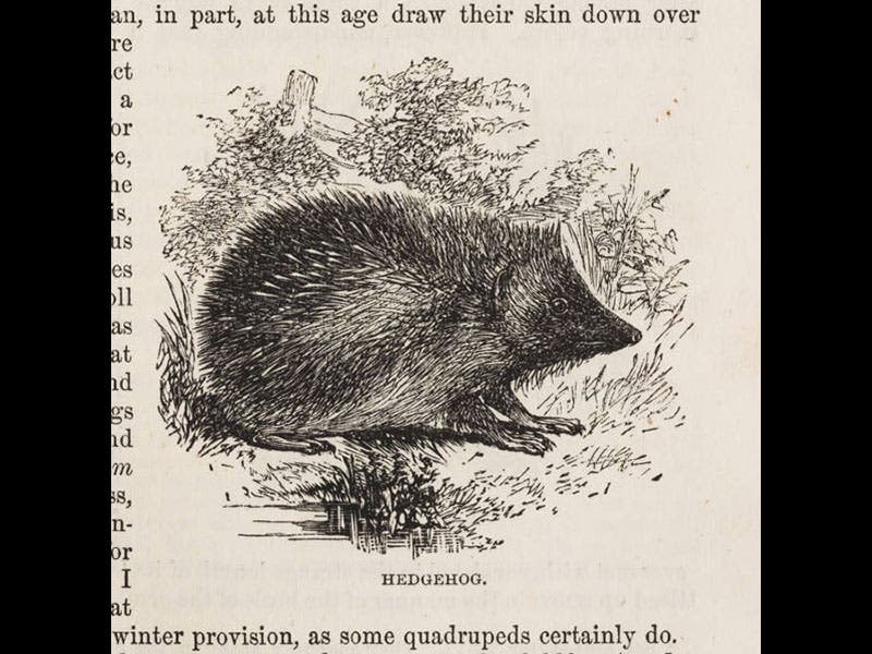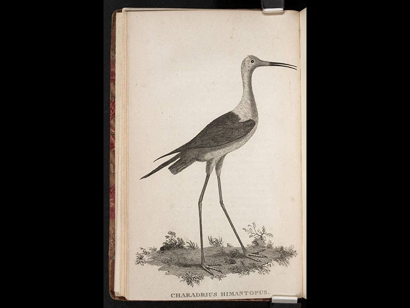 After a period of observing and recording, White began mining his diaries for interesting tidbits that he organized into letters that he sent to two friends, Thomas Pennant and Daines Barrington. In 1789, he collected these letters into a book, The Natural History of Selborne. This book is the most popular work of natural history in the English language, far outselling Charles Darwin and John Muir and any other naturalist you care to mention. Selborne has gone through well over 200 editions since publication. We have 20 of them in the Library. We show above the frontispiece (a view of Selborne, first image) and title page of the first edition (second image), a black-winged stilt from an 1825 edition (third image), the gold-embossed cover of the 1843 edition (fourth image), and a detail of a hedgehog from the 1853 edition (fifth image). If you have never read Gilbert White, find any edition you can (there are many still in print) and plunge in. The book will charm you from the first natural encounter, we guarantee it.