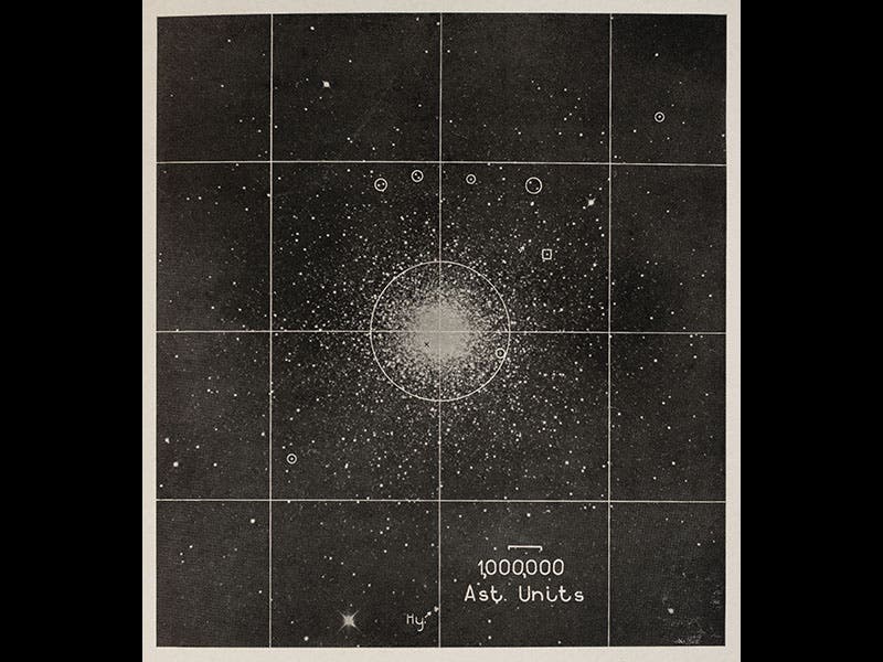 Shapley, working with the 60" telescope at Mount Wilson Observatory in Pasadena (second image), took photographs of several globular clusters and was able to identify a number of Cepheids among the stars of the clusters (circled in white on the photograph of M3). This allowed him to determine the distance to the globulars, which turned out to average a staggering 30,000 light years from our solar system. Since it was thought at the time that our Milky Way galaxy was only about 10,000 light years across, this meant that the clusters, which, we remember, appeared in only one half of the sky, were clustered about an empty center far outside of our Galaxy. This asymmetry is best demonstrated in a graph (third image), where the Milky Way is the small hatched ellipsoid at left-center, the other two hatched areas at the bottom are the two Magellanic Clouds, and the globular clusters are the dots, clustered around nothing much at all at the right.