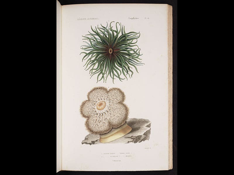 Milne-Edwards was responsible for the volumes on annelids, crustaceans, and zoophytes, and was a co-author of the volumes on mammals, insects, and arachnids, so the project kept him busy for many years (the last volume was published in 1849). We chose to illustrate this notice with some selected plates from Milne-Edwards’ Zoophyte Atlas volume, since zoophytes have been somewhat under-represented in this blog. The images depict, in order: two Actinia (anemones); several Physalia (including a Portuguese man o' war); some Holothuria (sea cucumbers); a beautifully pale Medusa; and a Gorgonocephalus (basket star) that looks like something out of Ernst Haeckel's Kunstformen der Natur (1904), only 60 years earlier.