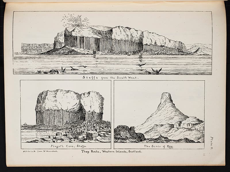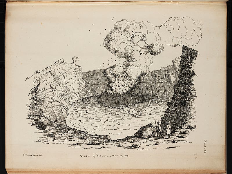 Henry De la Beche, an English geologist, was born Feb. 10, 1796. He travelled extensively in his younger years and made geological sketches of the places he visited, for he was a skilled artist. In 1830, he published Sections and Views Illustrative of Geological Phaenomena, which he illustrated from his own drawings. And perhaps because he liked rocks and stones, he was an early convert to lithography, and all of the prints in this work are lithographs that De la Beche executed himself. As you can see, he preferred fairly simple crayon-pencil drawings, although he was quite capable of more textured work when it was appropriate, as the colored view of Mont Blanc above indicates. The other illustrations above show the island of Staffa in the Outer Hebrides, home of Fingal’s cave, and the crater of Vesuvius. The title page is lithographed as well.