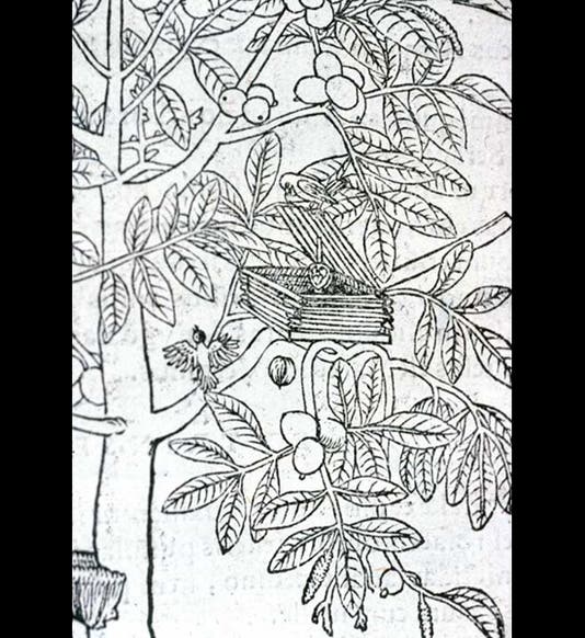 For the 1546 edition of Bock’s herbal, now called De stirpium (On plants), woodcuts were added, by the artist David Kandel. The flower illustrations were mostly copied from those of Brunfels or Fuchs, but in the section on trees, Kandel carved his own path (since Brunfels and Fuchs depicted few trees), displaying a botanical whimsy that has seldom been equaled. The woodcut of a chestnut shows chestnuts in their spiny shells lying on the ground, along with a hedgehog, who looks much like a larger-size chestnut (third image). The woodcut of a mulberry plays out, underneath the tree, the entire story of Pyramis and Thisbe, whose tragic deaths were supposed to have turned the fruit of the mulberry blood-red (fourth image). And the illustration of a walnut tree gave Bock (or Kandel) the chance to include, buried amidst the foliage, a bird trap, just like the ones you used to make with a cigar-box and a pencil (second image). You will note, in the detail, that the intended victim perches just above, on the lid, defiantly untrapped (first image).