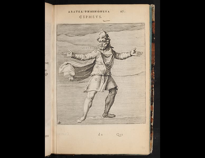Hugo Grotius, a Dutch scholar, was born Apr. 10, 1583. In 1600, when only 17 years old, Grotius published his second book, an edition of an ancient astronomical treatise, the Phaenomena, by Aratus, with commentary by Germanicus. What makes this book special is the manuscript on which it is based. Grotius had somehow acquired an illuminated copy of Aratus's text, produced around 816 AD. The manuscript had 35 "miniatures" of the constellations, which are in fact full-page paintings. Grotius had these illustrations copied as engravings by the great Dutch engraver, Jacobus de Gheyn and then printed in his book. We see above the constellation Cepheus in Grotius's Arataea (first image), and the manuscript painting on which it was based (second image). The third image depicts Grotius's engraving of Andromeda.