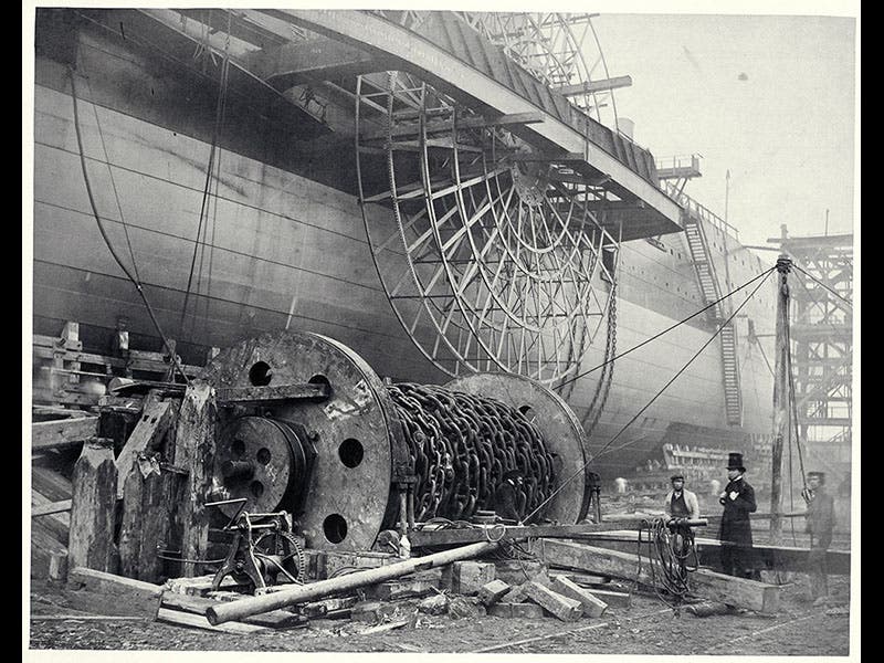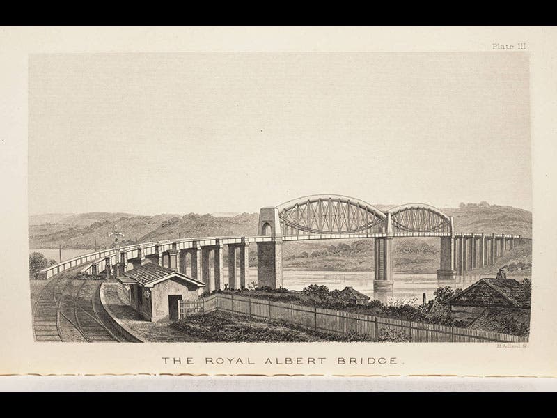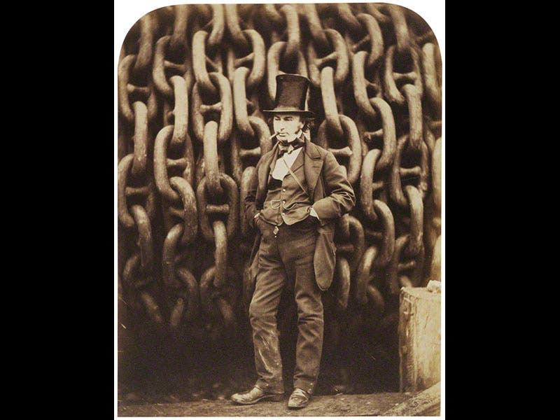 The photograph of Brunel, standing by the mooring chains of the Great Eastern in 1857, was taken by Robert Howlett and is perhaps the most iconic photograph in the history of engineering. The other images show, in order): the Great Eastern under construction (also a Howlett photograph); the Great Eastern at sea (from an 1866 book on the laying of the Atlantic cable); the Royal Albert Bridge of the Great Western Railway, designed by Brunel, under construction, from an 1861 book on bridges; and the completed bridge, from an 1870 biography of Brunel.